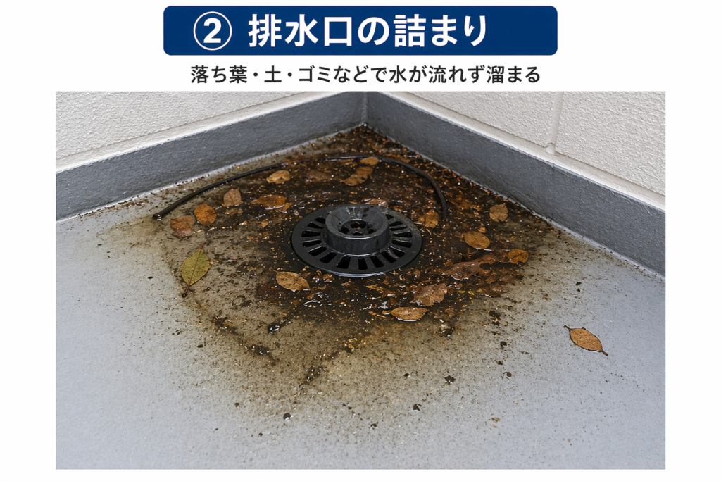 - ✔ 常に雨水が溜まりやすい(平面構造)